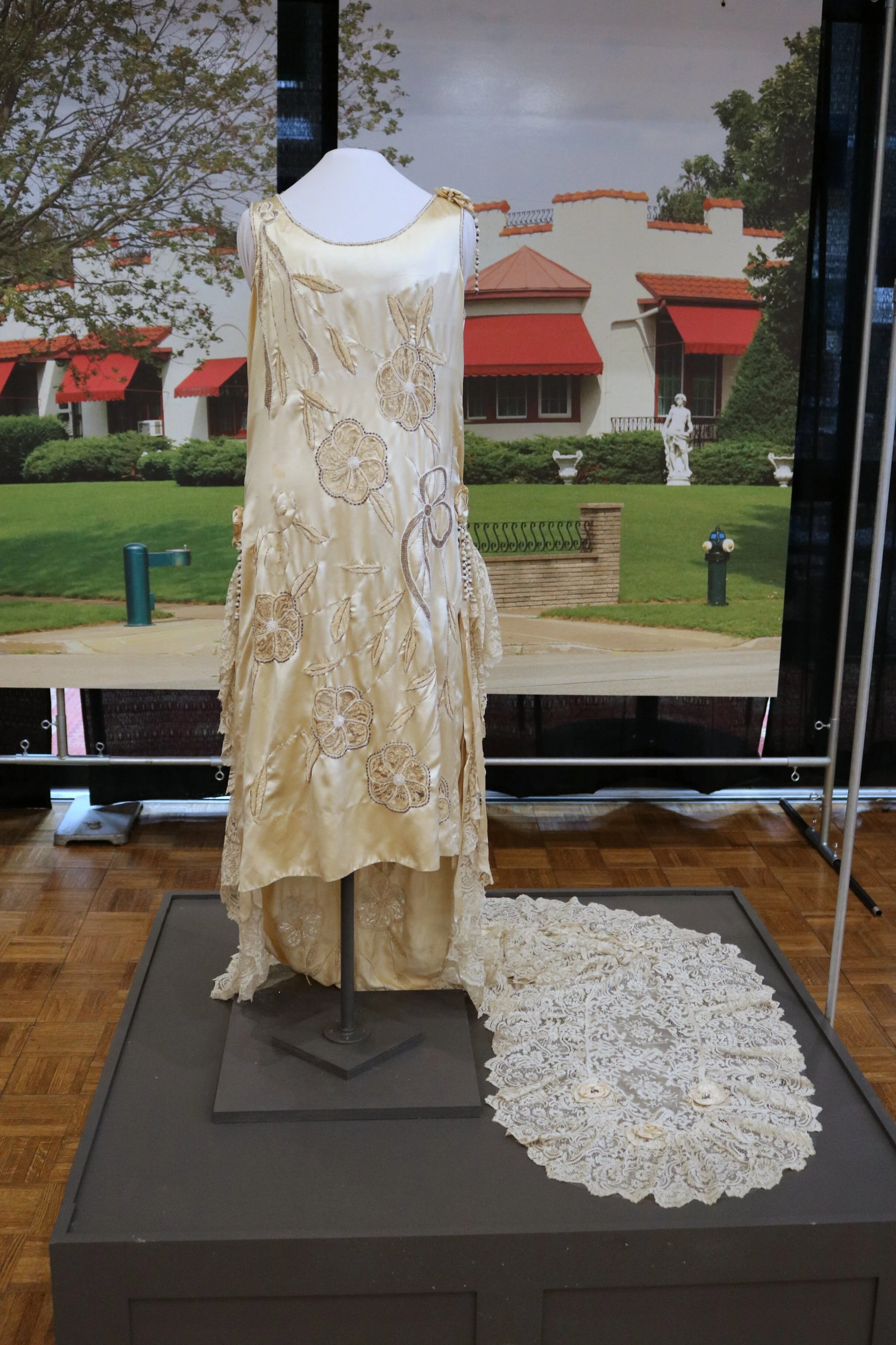 Evening dress with lace train, c. 1925