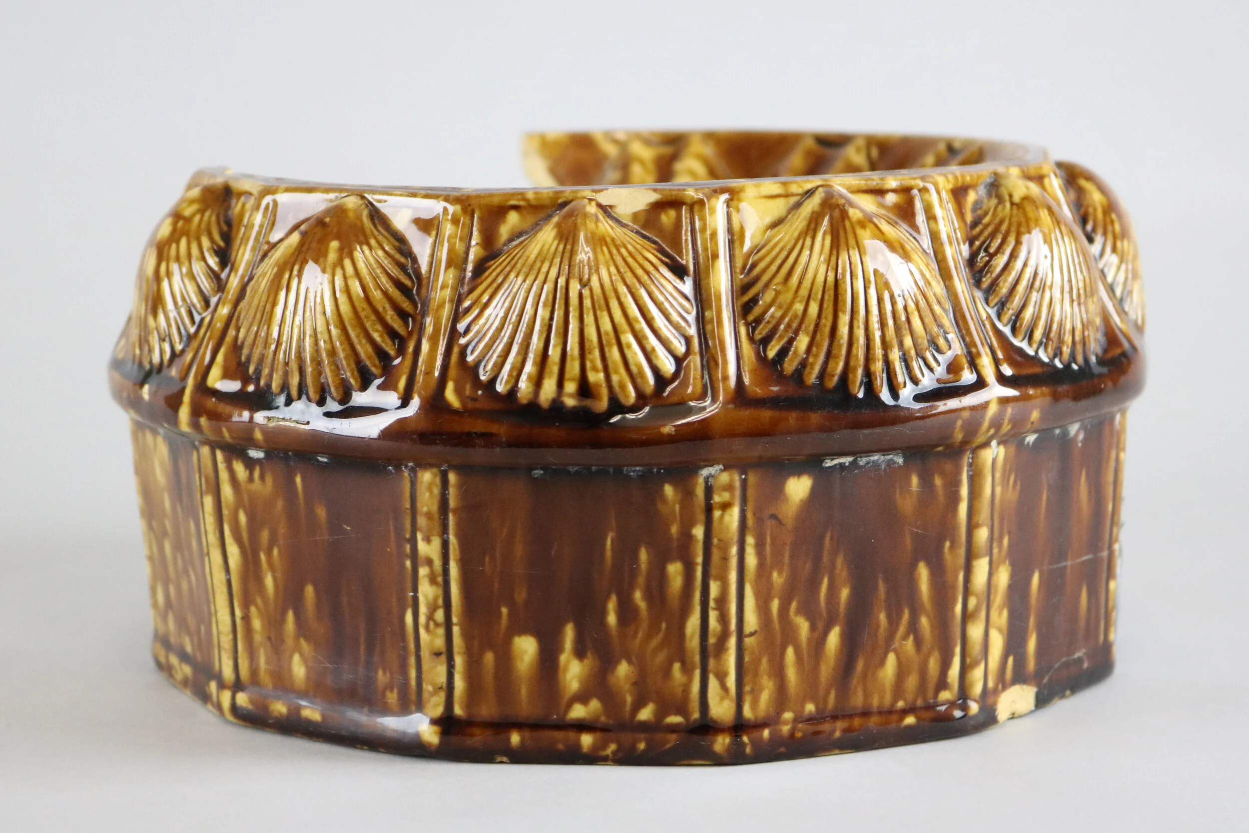 Four fancy decorative spittoons were pulled out of the river. One features a variegated brown Rockingham style glaze with twelve applied clam shells on the shoulder. Unfortunately, it is broken, but this and the other spittoons were high-end, and would have been appropriate for receiving the tobacco spittle of gentlemen at their fraternal club, a fancy hotel, or possibly the main cabin of a steamboat like the War Eagle.