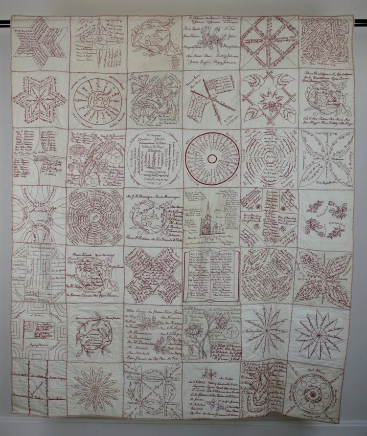 The quilt was a fundraiser, but it also documented the lives and work of the women who made it. At the turn of the century, women in La Crosse were largely excluded from the most visible positions of public service; they were not pastors or mayors or high school principals. And yet, the family and social networks they cultivated and nurtured were the city’s bedrock. As Peggy Derrick, Executive Curator for the La Crosse County Historical Society explains, “these textiles remain as testaments to the engagement of women in public life even when they did not vote or often hold public office.” Derrick suggests subscription quilts such as this one honor friendships and family and social connections that might otherwise remain invisible to the historical record. The quilt is far more than a blanket; it’s an account of women’s everyday lives and work, “written” by the women of Norwegian Evangelical Lutheran Church more than a century ago.