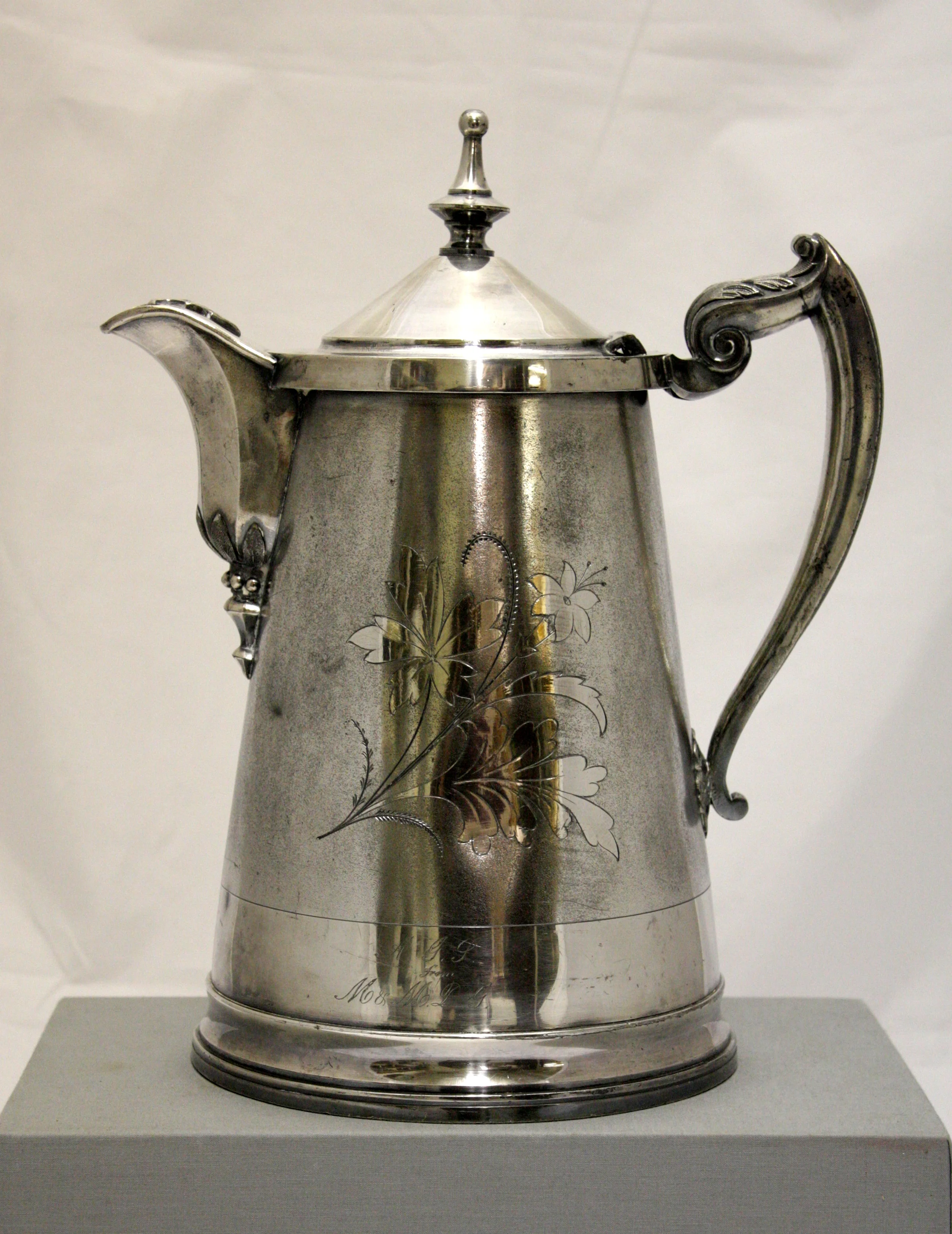 This large glass-insulated, silver-plated water pitcher, with its 1865 patent date, is said to have belonged to Fredericka and John Levy. It makes a very appropriate symbol for a couple whose home became synonymous with hospitality in the tiny settlement that was La Crosse when they arrived in 1846. Their one and a half story log cabin was in fact only the fifth settler’s home on Prairie La Crosse.