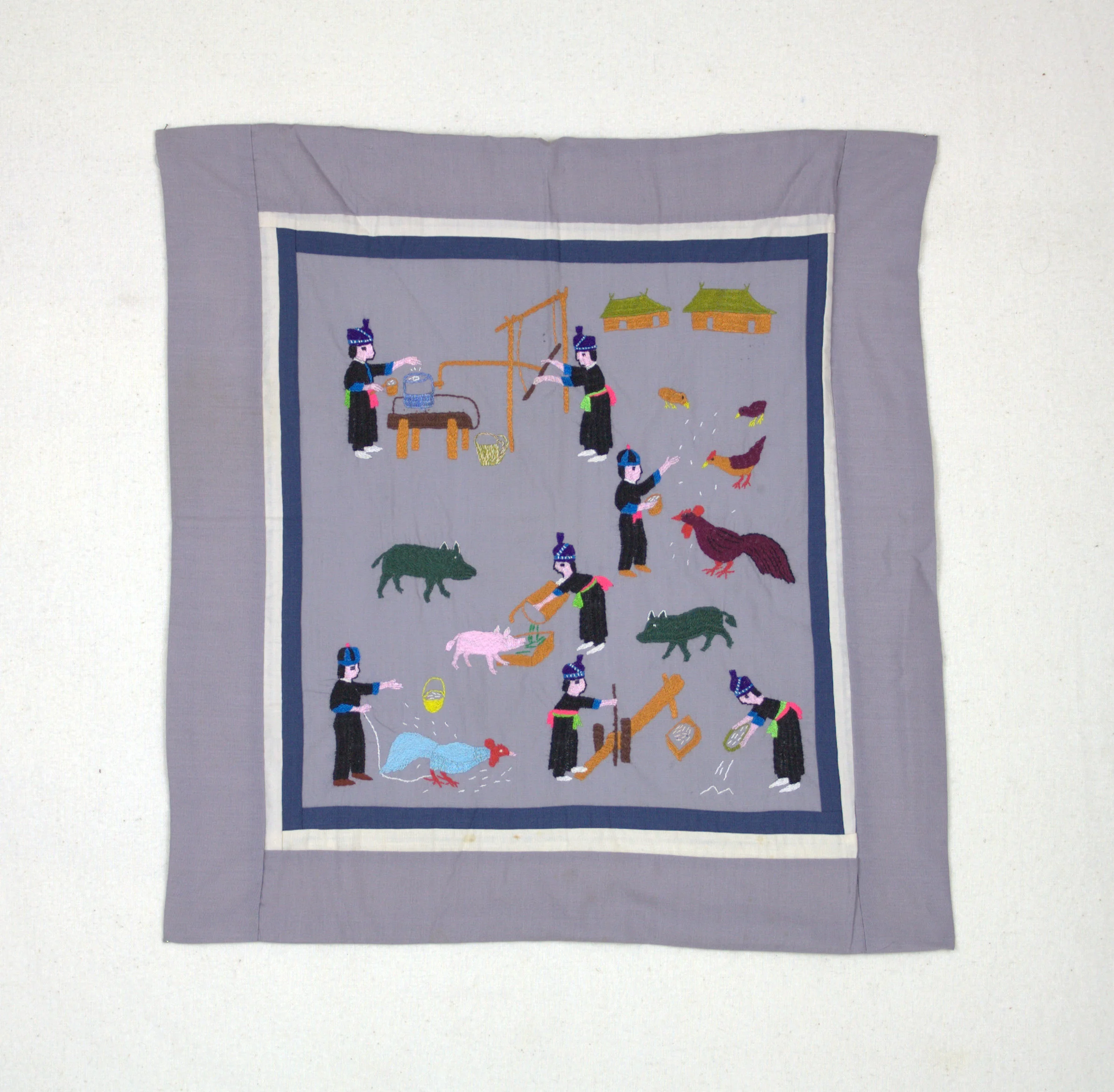 This little story cloth belonged to Betty Weeth, a resident of La Crosse who worked with social agencies to facilitate the resettlement process for the first Hmong people to make La Crosse their new home. It is easy to imagine that it was made by a person feeling homesick, with imagery restricted to domestic activities the new residents must have missed from their homeland: feeding livestock, processing their rice crop by hand, and weaving at an upright loom.