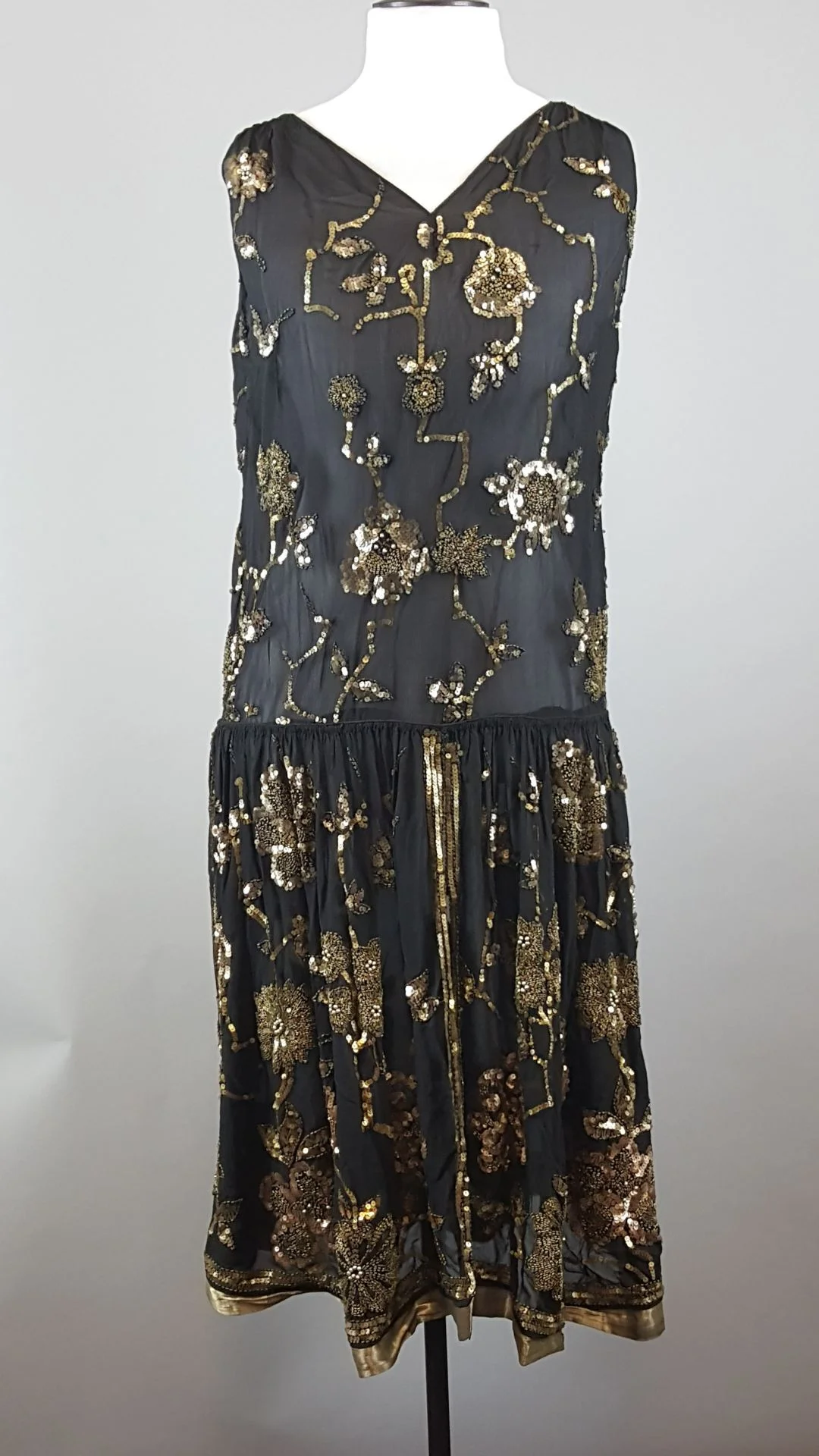 This gorgeous dress was donated by the late Barbara McMahon in 1978. The sleeveless, drop-waist dress is a black silk chiffon, covered with floral designs of metallic sequins and tiny metal beads. Their colors darken from silver at the neckline to copper, gold and bronze as the complex design flows down to the bottom hem. (Trust me: The photo doesn’t do it justice.)