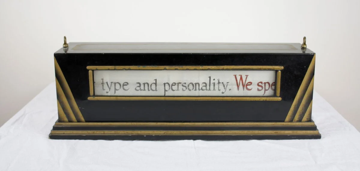 The mechanical sign shown here was used in Joseph Bicha’s fur shop as advertising for the proprietor’s custom-made coats. It is a black-and-gold metal box painted in the art moderne style of the 1930s and 1940s. It has a glass pane across the front and houses a small electric motor that turns a continuous hand-lettered streamer: “We specialize in custom made coats. A fur coat is the most becoming garment for any woman if designed to fit her type and personality.”