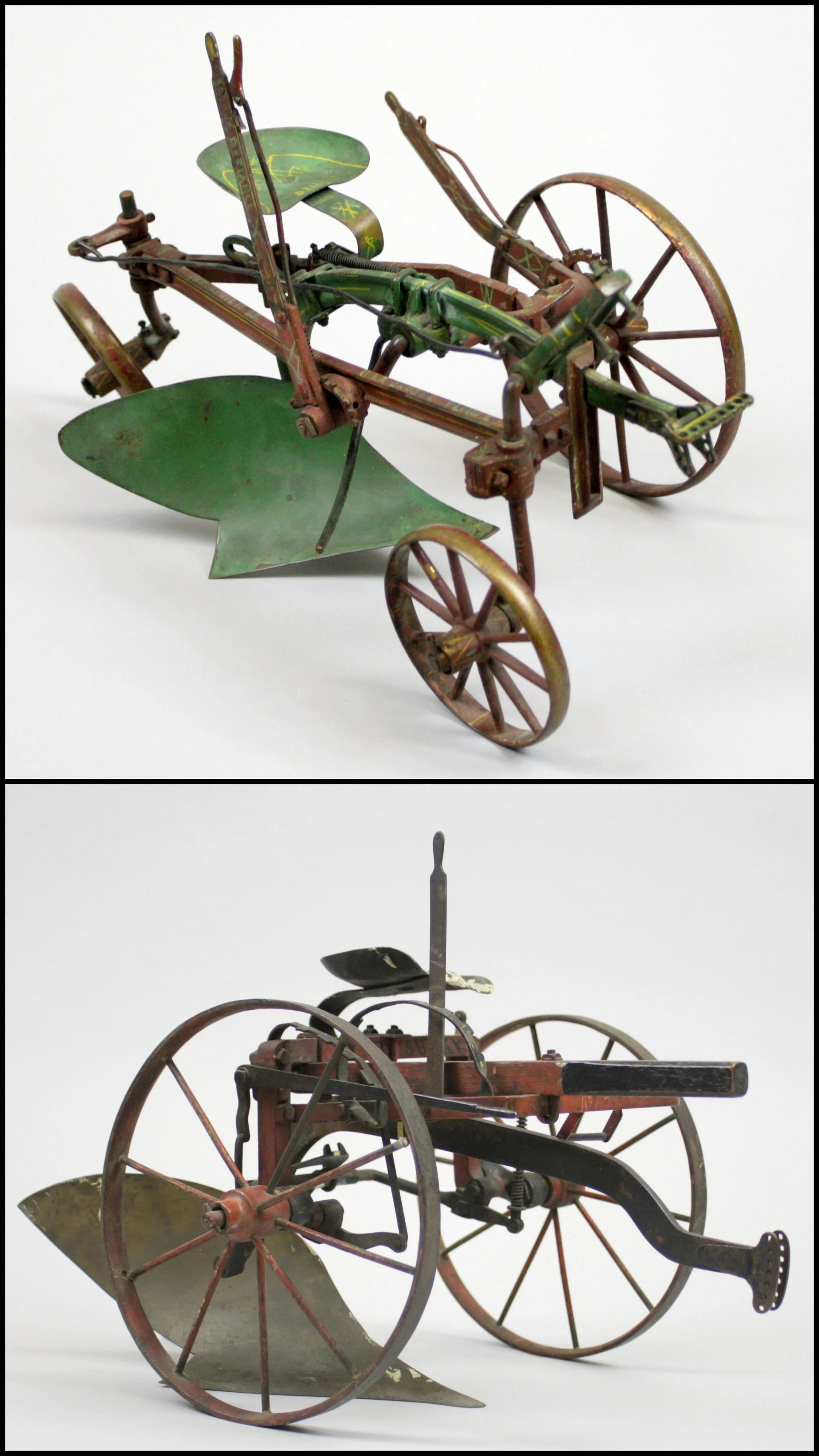 The upper image is also a sulky plow, built entirely of metal; this model is only 5 inches high. A bit more ornate, with gold design and lettering, the second model was made circa 1895.