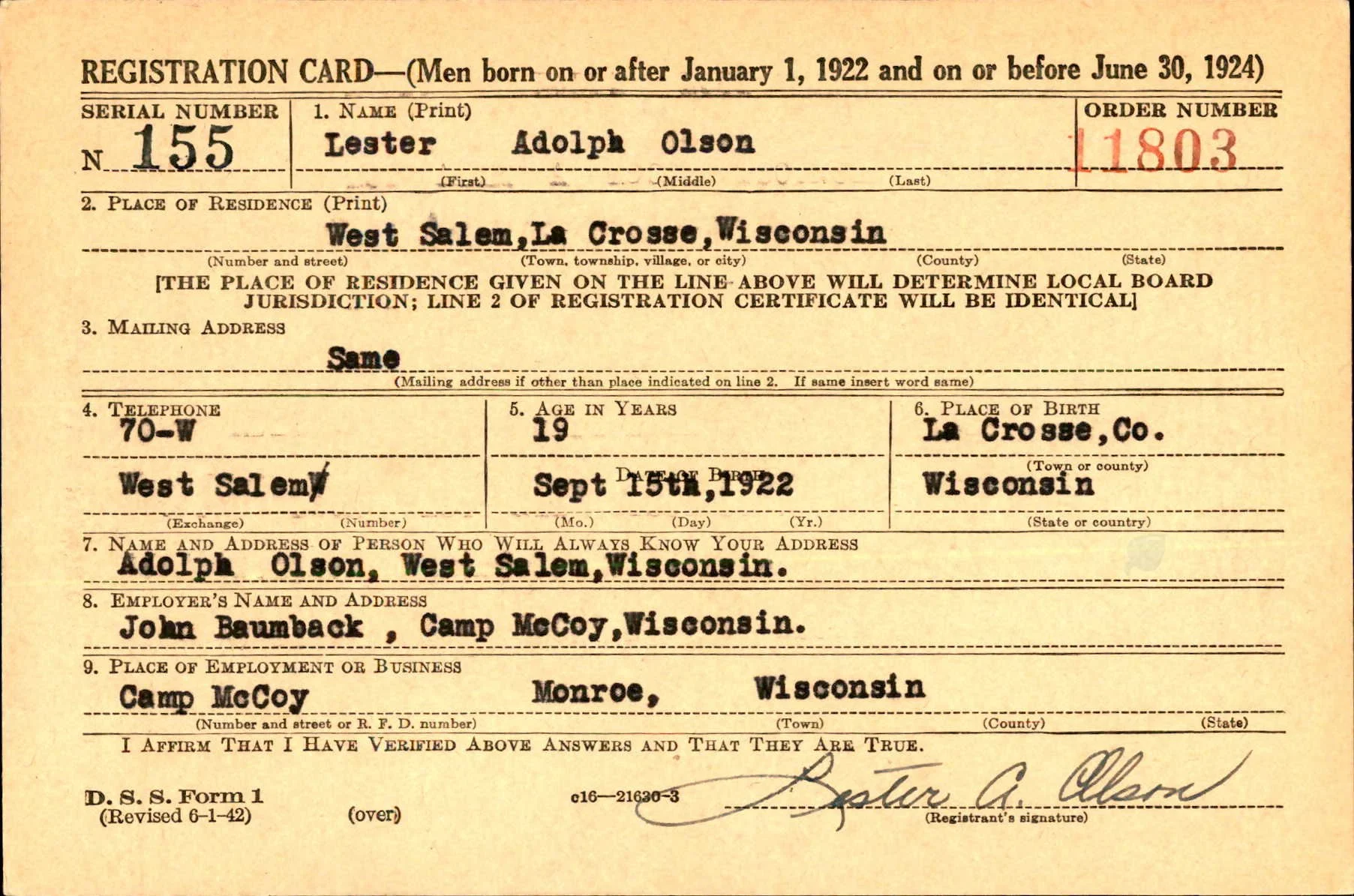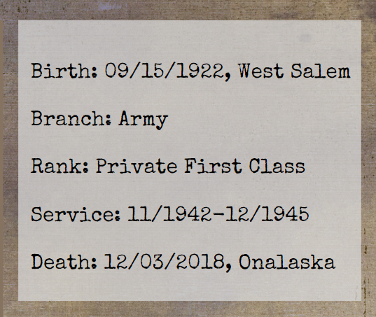 Following Pearl Harbor, West Salem’s Lester Olson, joined the Army. His brothers Maynard (Army Air Corps), Melvin (Navy), and Everett (Army) also served in WWII, and another brother Willard, served during the Korean conflict.