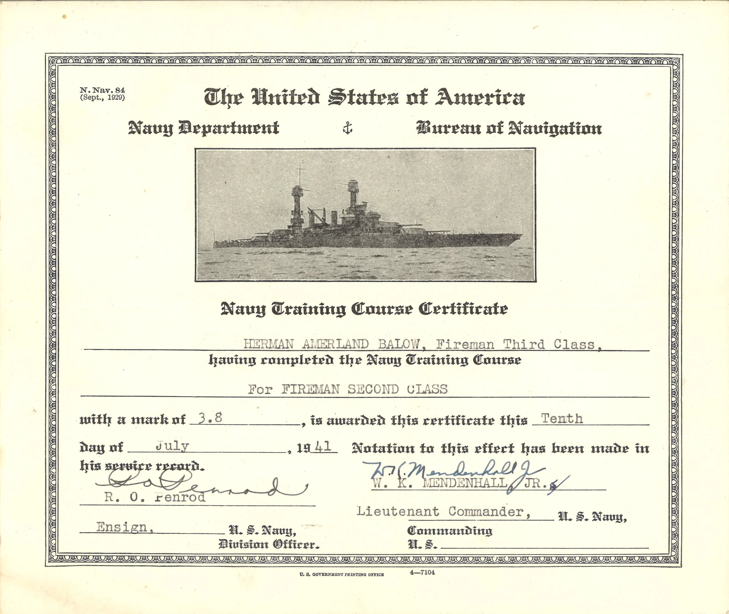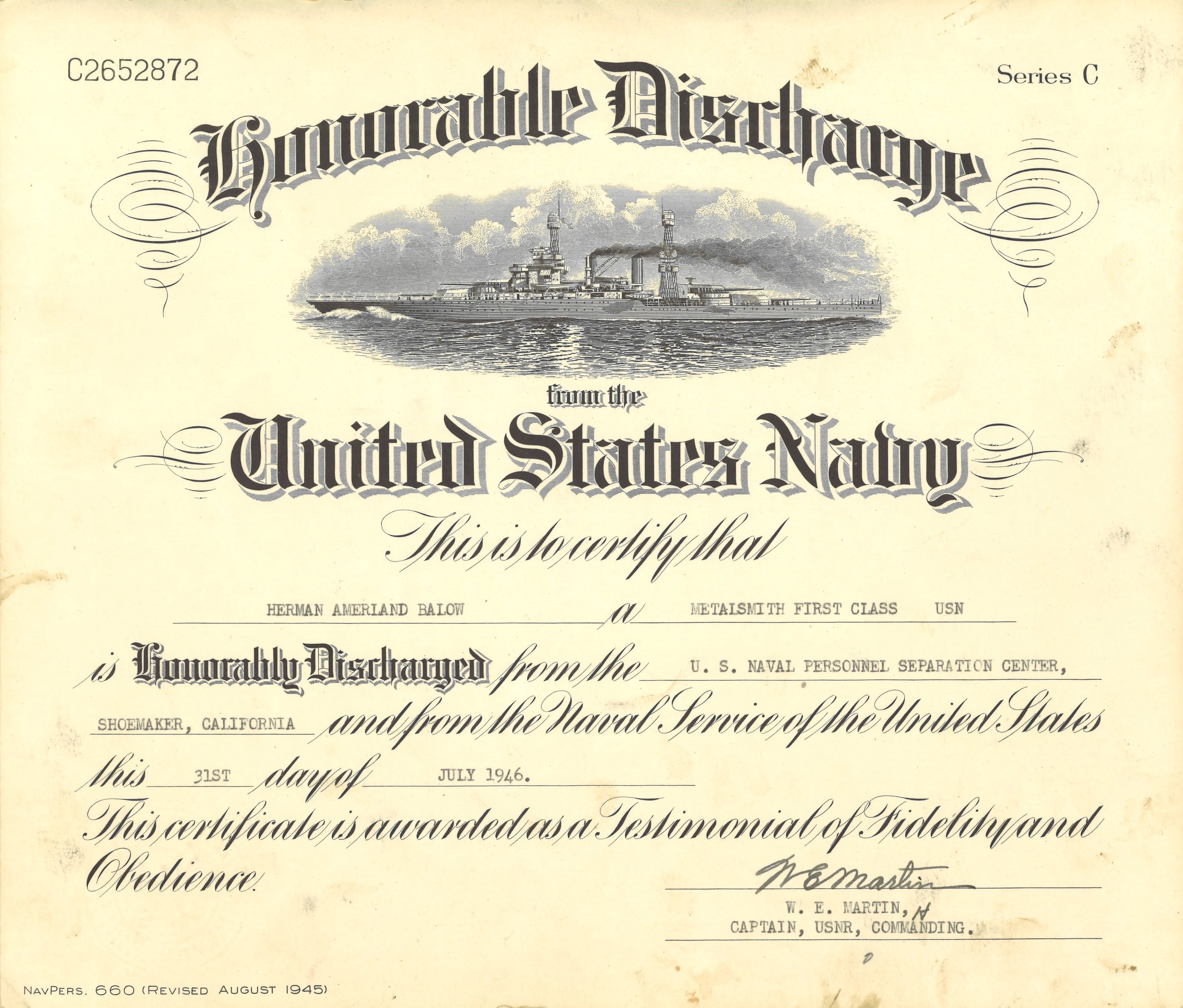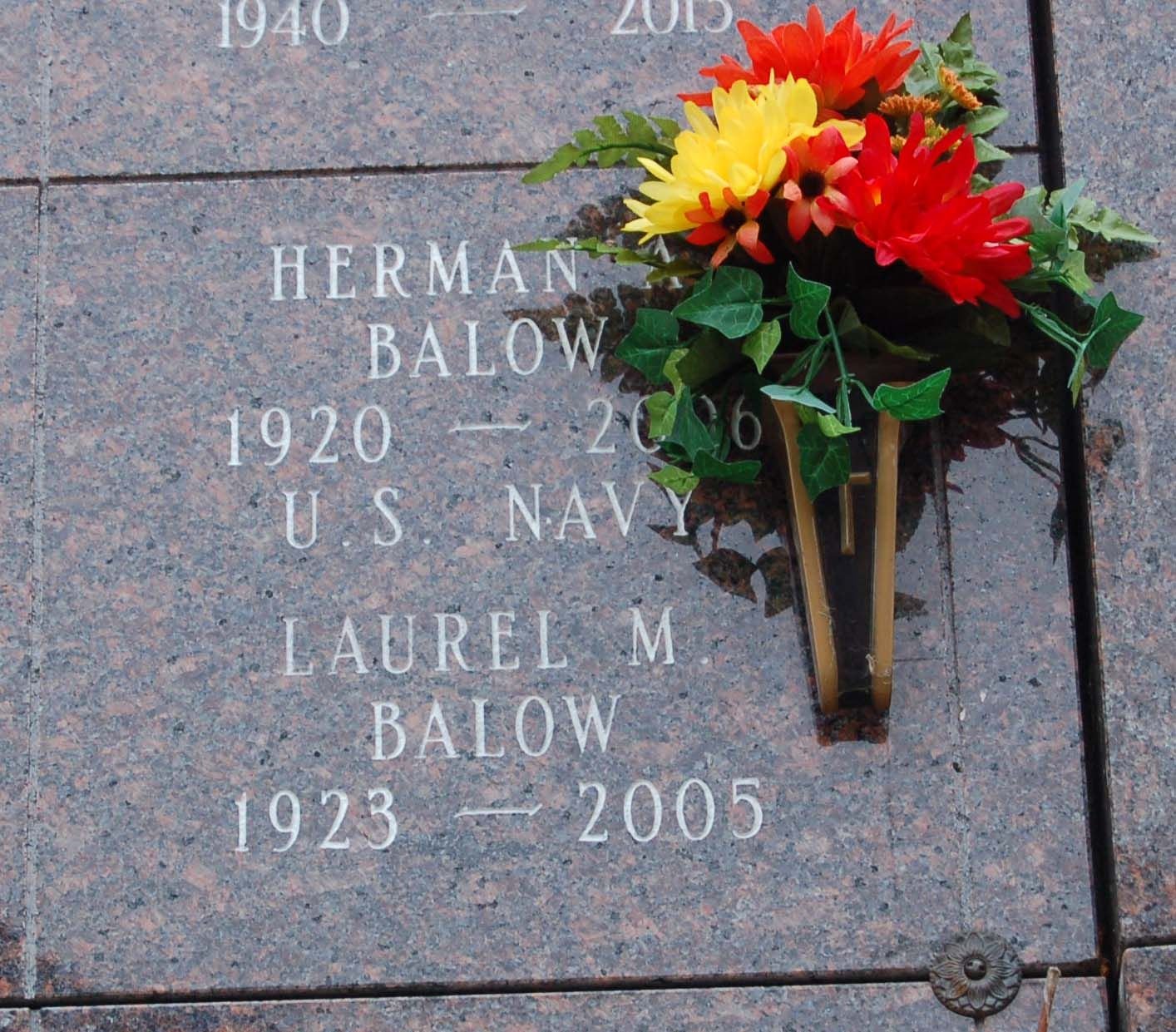 Herman Amerland Balow joined the Navy in June of 1940 and completed his basic training at the Naval Station Great Lakes in Illinois. He served on the USS Meredith (DD-434), USS Flusser (DD-368), USS Kasaan Bay (CVE-69), and the Naval Frontier Base in San Francisco.