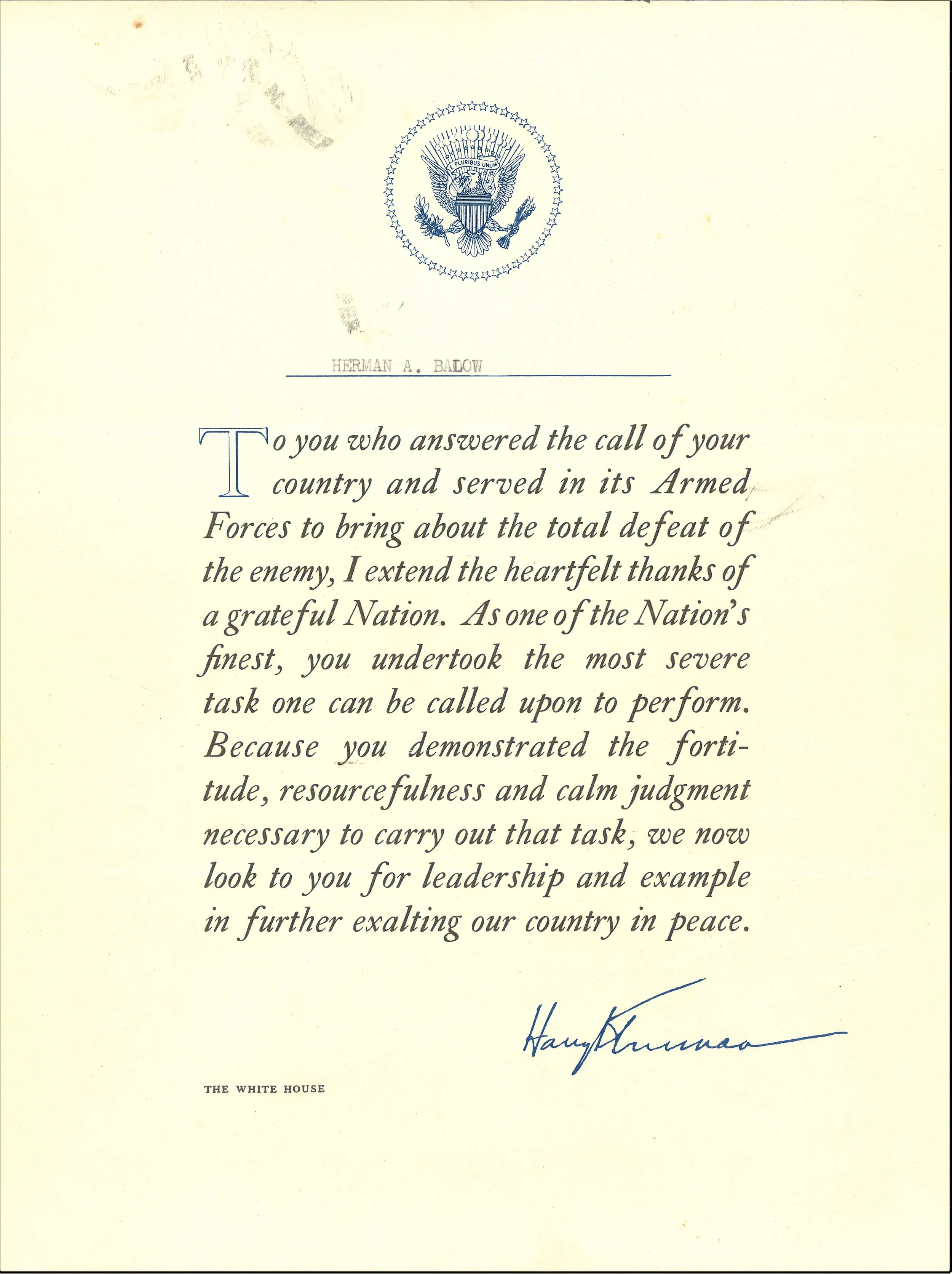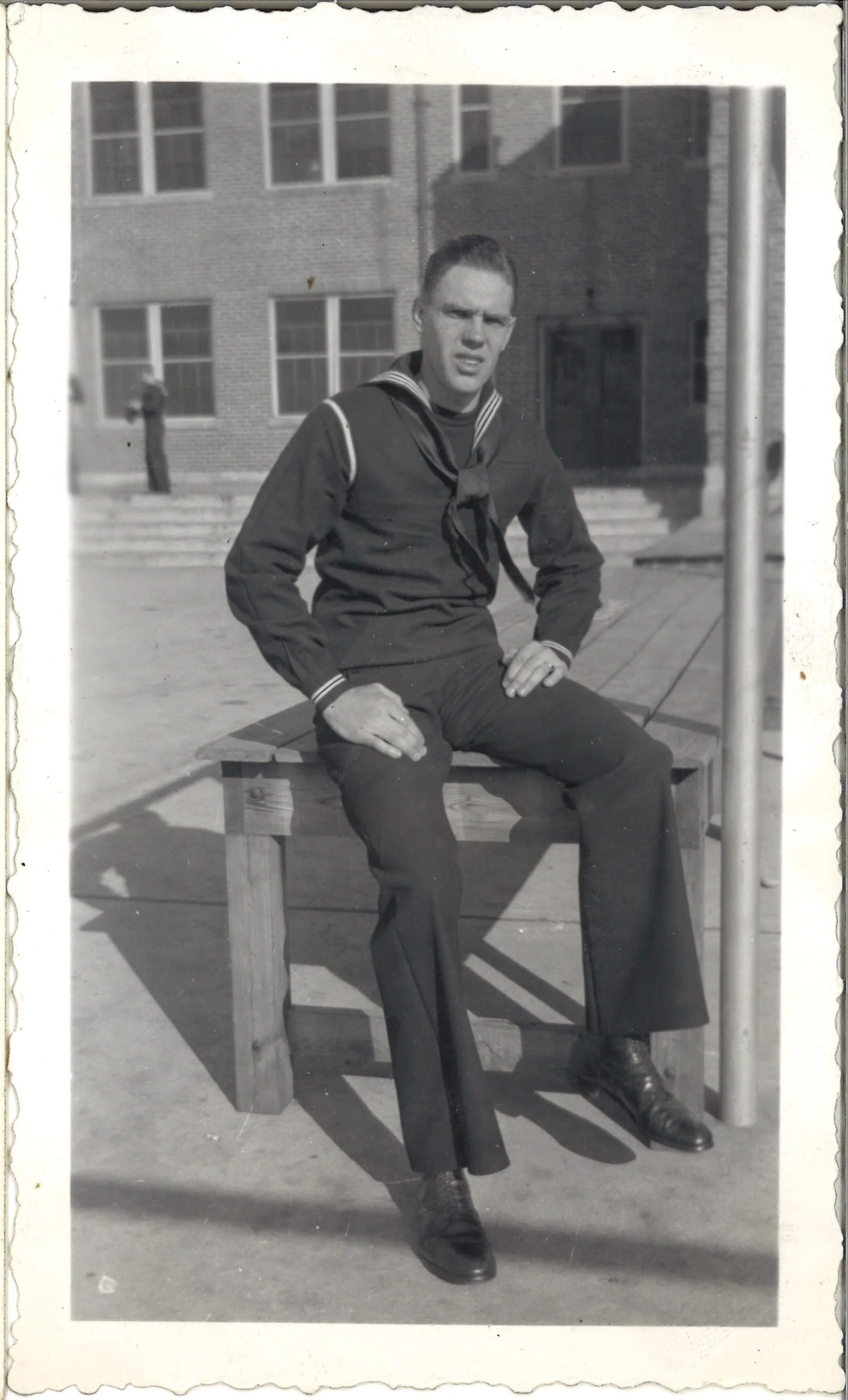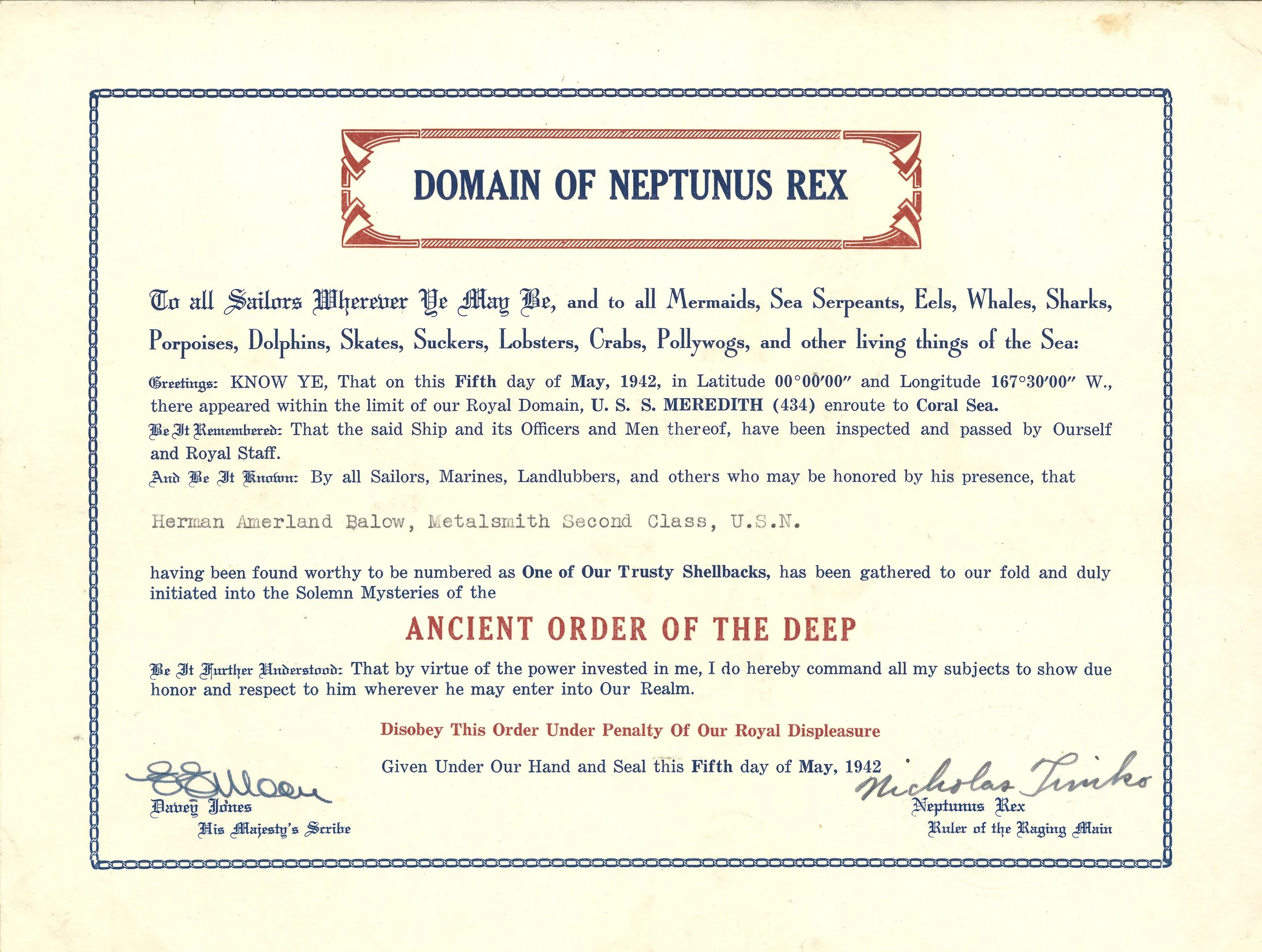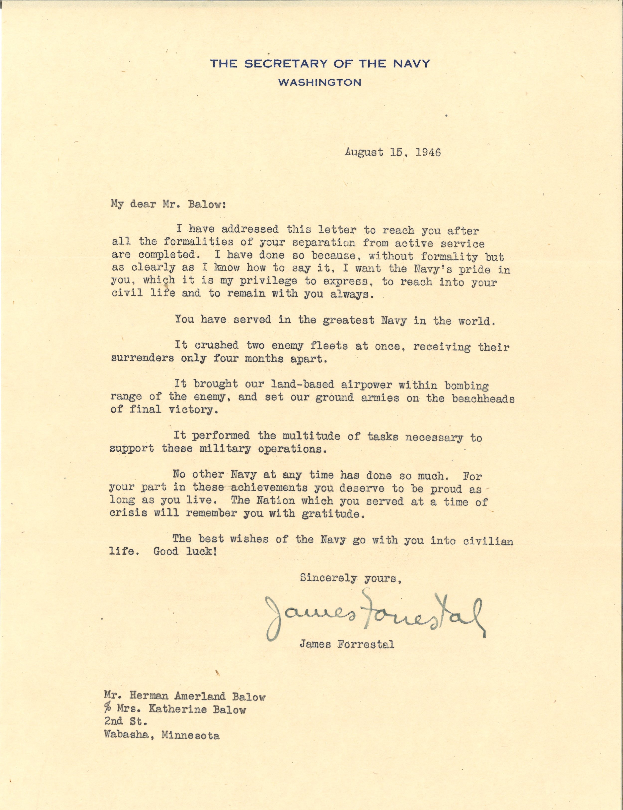 Herman Amerland Balow joined the Navy in June of 1940 and completed his basic training at the Naval Station Great Lakes in Illinois. He served on the USS Meredith (DD-434), USS Flusser (DD-368), USS Kasaan Bay (CVE-69), and the Naval Frontier Base in San Francisco.