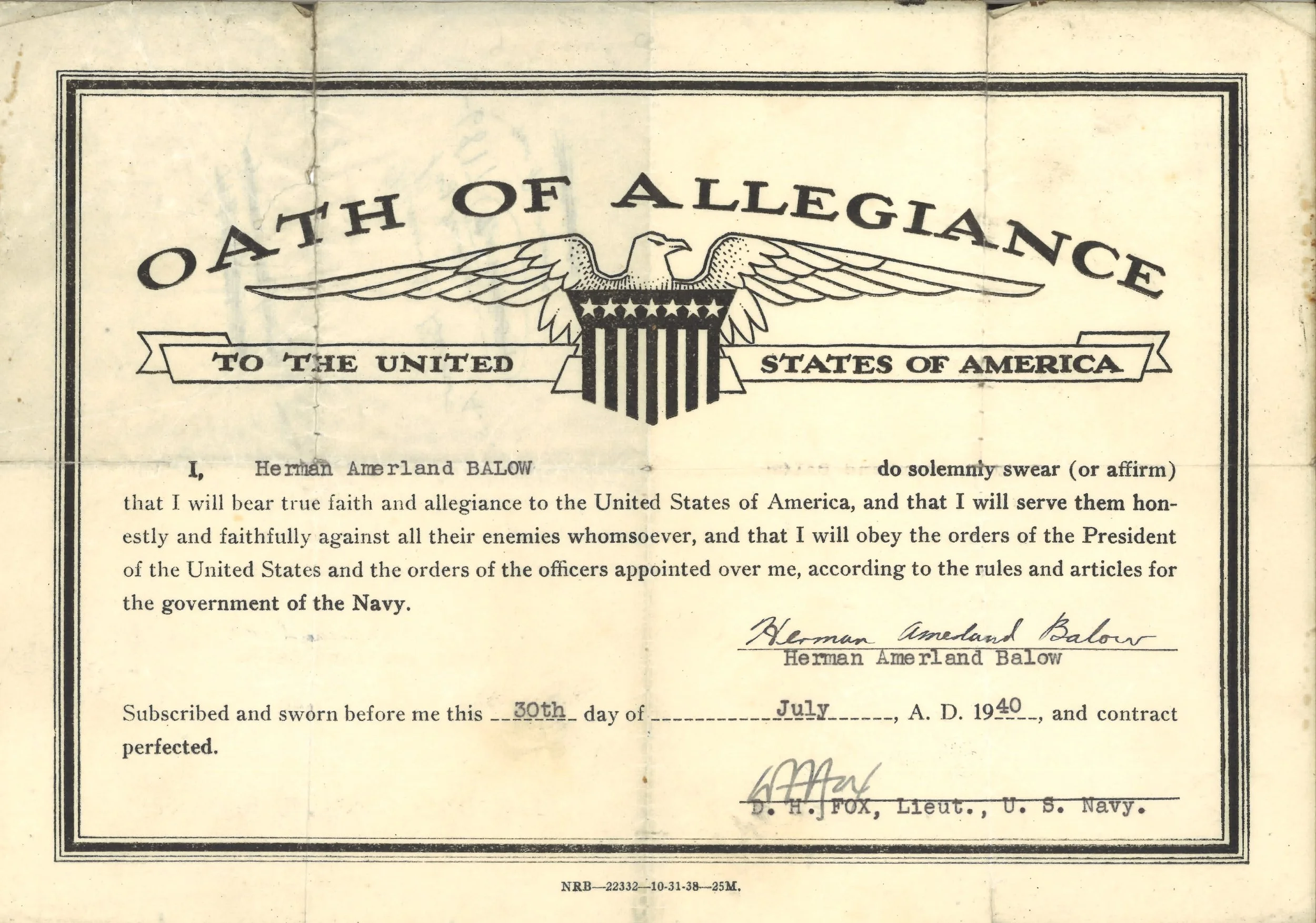 As a metalsmith first class, Balow was a highly skilled metalworker who was responsible for a wide range of tasks related to the maintenance and repair of ships and aircraft to keep them in fighting condition. His duties might have included laying out and fabricating metal construction, fitting and repairing pipes and tubing, maintaining tanks and watertight fixtures, fabricating and repairing aircraft sheet metal, piping, radiators, and instruments, welding, machining, and forging aircraft parts, and maintaining fire fighting equipment and breathing apparatuses.